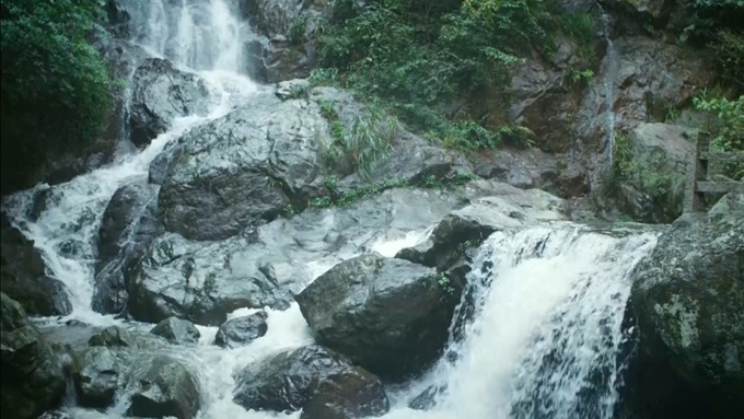 山中瀑布,势穿松岛,色喷成雪,如若云华月光,白净似练,风象清幽,仿佛仙境。